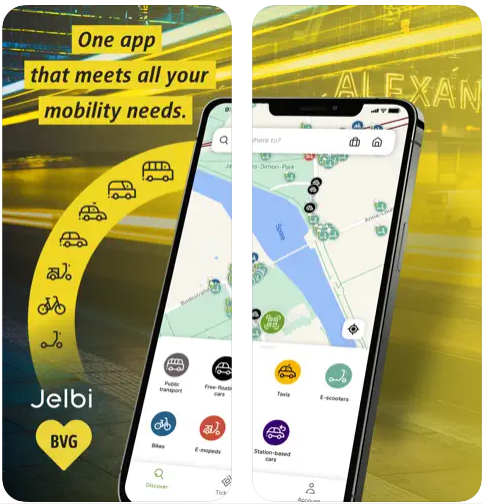 O Jelbi é um aplicativo desenvolvido pela BVG, empresa responsável pelo transporte público de Berlim. Ele oferece informações sobre todas as linhas de metrô, ônibus, trem, patinetes, compartilhamentos de carros, bicicletas, táxis e micro-ônibus da cidade.
