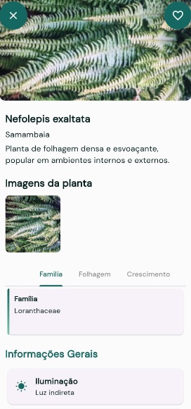 • O app também exibirá informações detalhadas sobre a espécie, como cuidados necessários, curiosidades e muito mais.